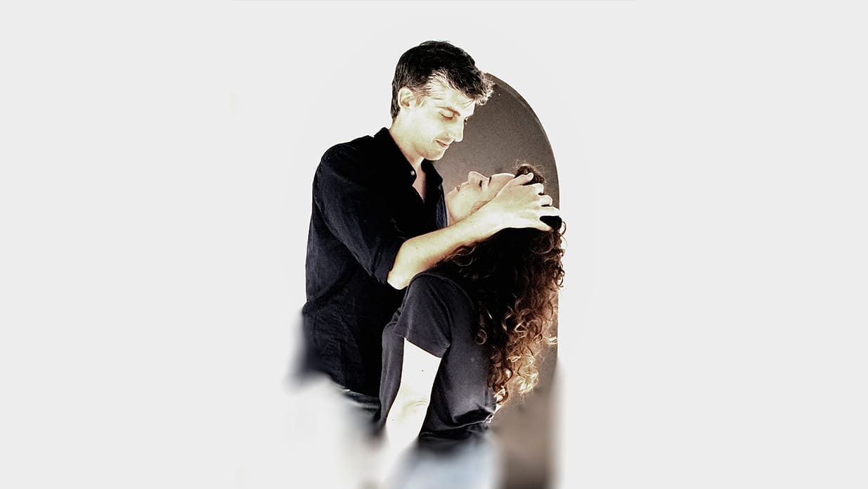 A white man with dark hair stroking a womans hair back whilst holding her
