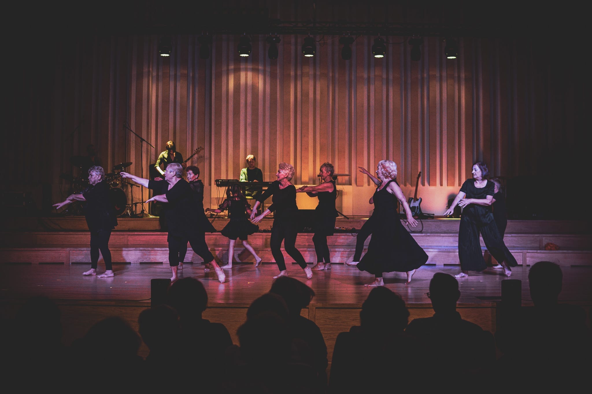 A small ensemble of dancers are performing on stage. The dancers have a diverse age range, from children to older dancers. They all wear a variety of simple black costumes - dresses, leggings and jumpsuits.